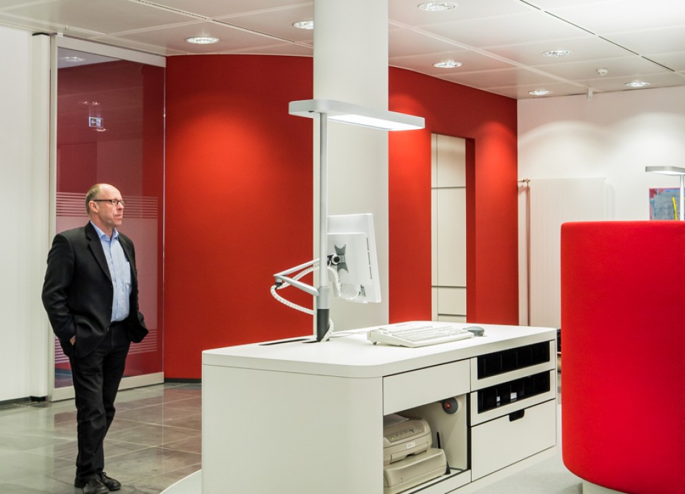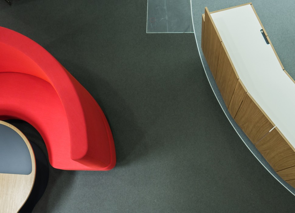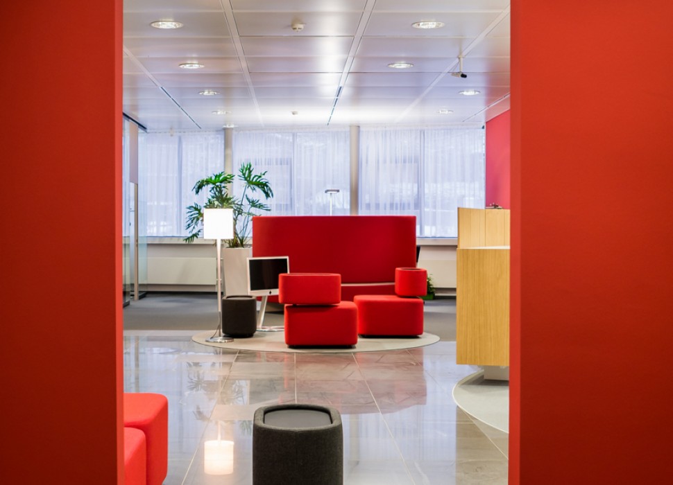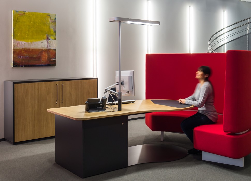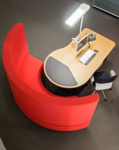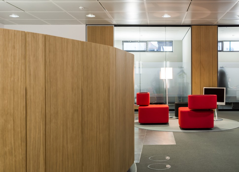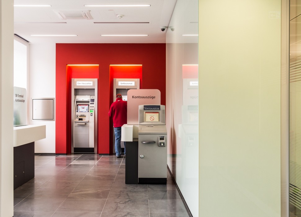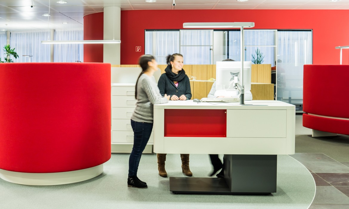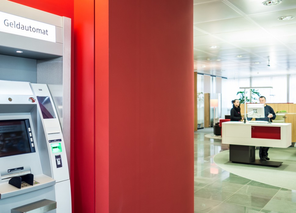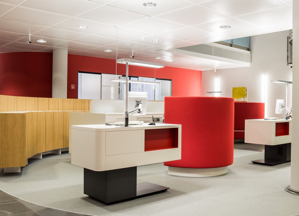 Über eingestellte Möbelelemente wurde die Kundenhalle dieser Filiale neu strukturiert. Die gepolsterten Beratungsplätze schaffen optimale Diskretion im offenen Raum.
