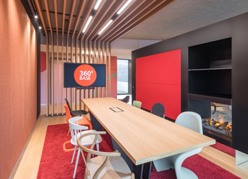 In der angrenzenden Lounge gibt es eine Sitzgruppe mit offenem Kamin, einem Besprechungstisch und einer Kaffeebar.