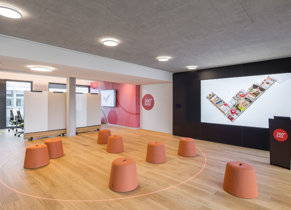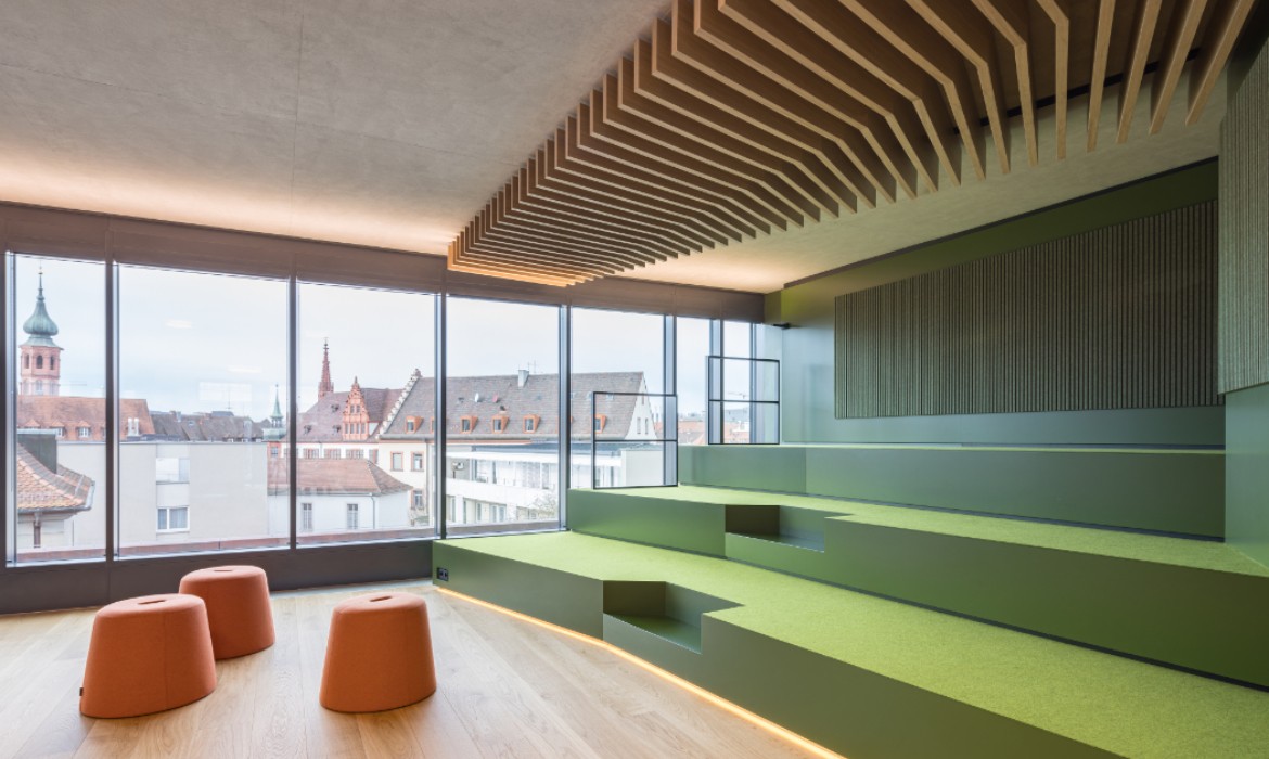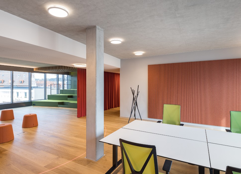 Es gibt einen großen Multifunktionsraum, der mit einer filzbezogenen Sitztreppe strukturiert ist. Das räumliche Element ist kommunikativ und ideal für Vortragssituationen.
