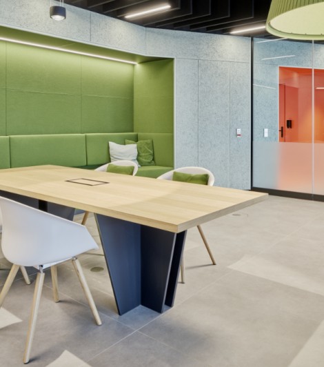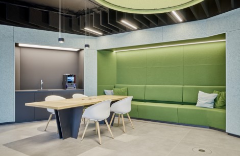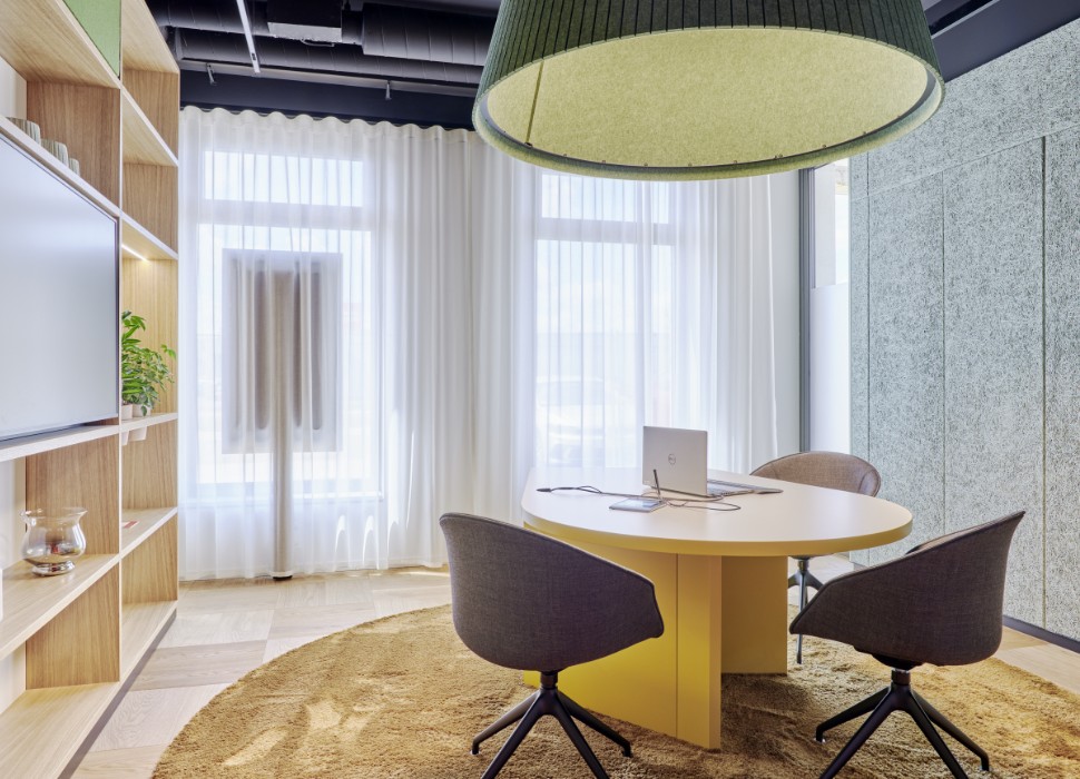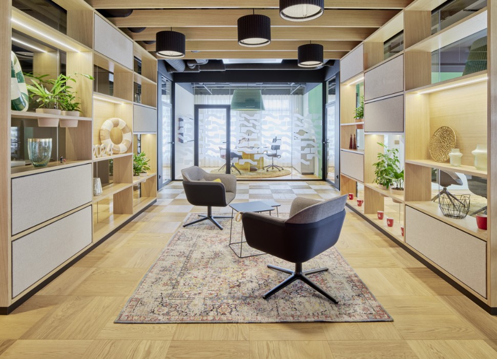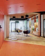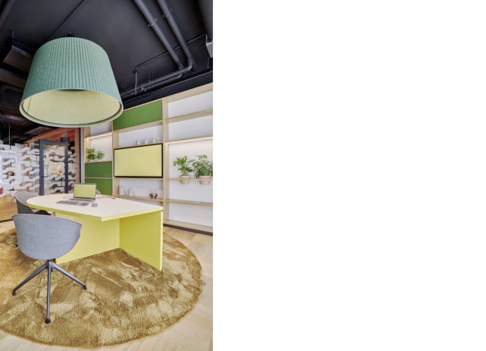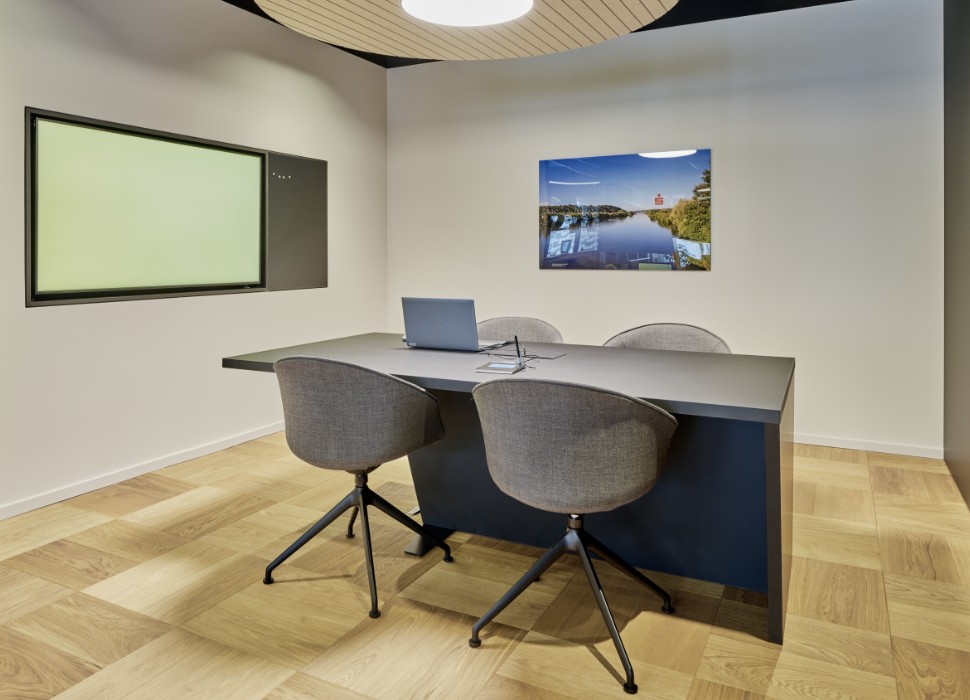 Mit seinen mobilen Möbeln lässt sich der Servicebereich schnell für andere Zwecke wie eine Vortragsveranstaltung verwandeln.