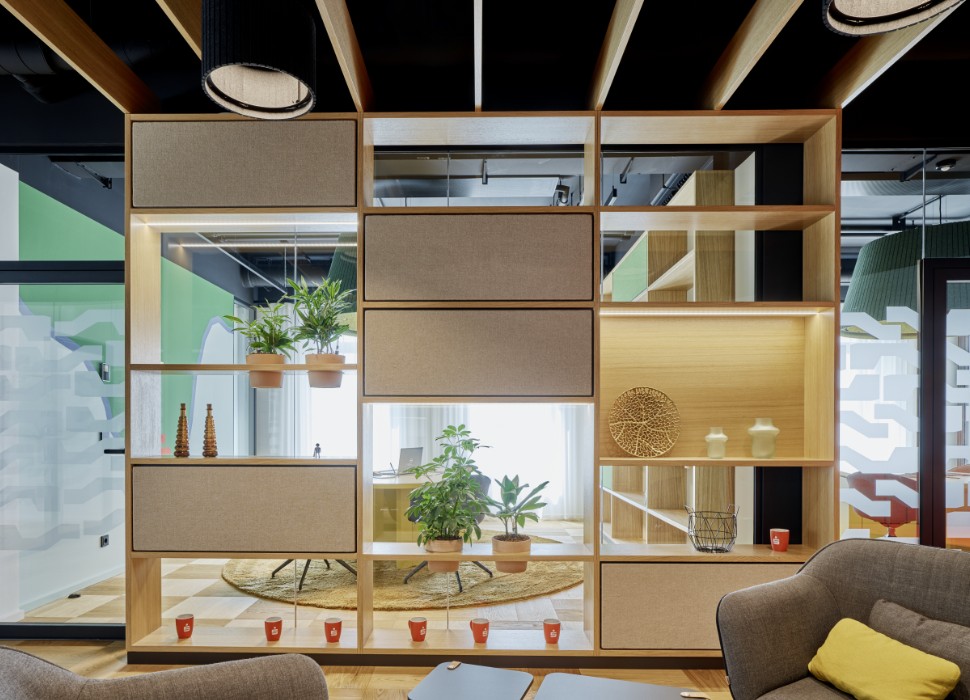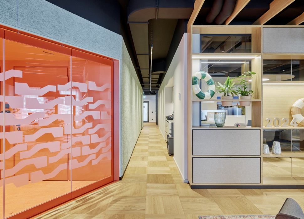 Der nahe Main hat uns zu der wandfüllenden "Flußgrafik" inspiriert, die sich bis in die Glasmattierung fortsetzt.